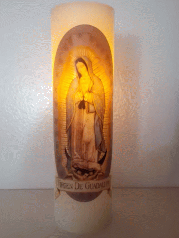 Paglalarawan ng Content: a candle with a picture of the virgin of guadalupe