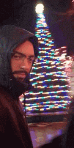 Paglalarawan ng Content: a man wearing a hooded jacket is standing in front of a christmas tree