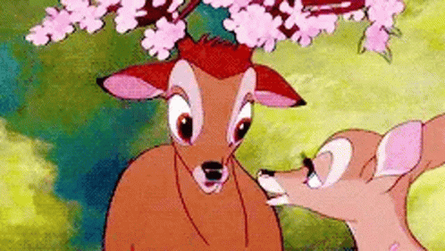 Paglalarawan ng Content: a couple of deer standing next to each other under a tree with flowers .