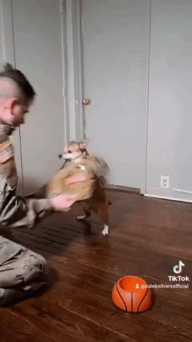 Paglalarawan ng Content: a man and a dog are playing with a basketball and a bowl of food on the floor .