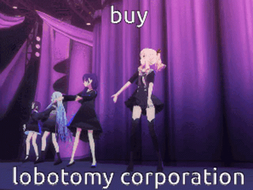 Paglalarawan ng Content: a group of anime girls are dancing on a stage and the words buy lobotomy corporation are above them