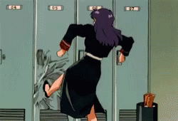Paglalarawan ng Content: a woman in a black dress is running in front of lockers that have the numbers 1 through 9 on them
