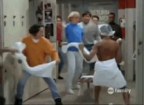 Paglalarawan ng Content: a group of people are standing in a locker room with towels on their heads .