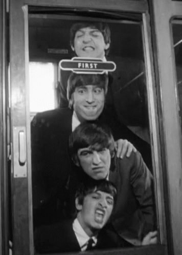 Paglalarawan ng Content: a black and white photo of the beatles with their faces on a sign that says first