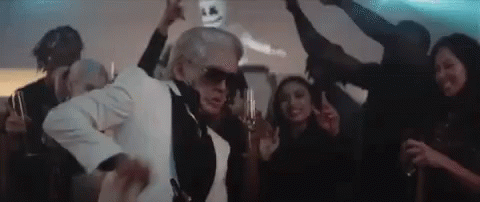 Paglalarawan ng Content: a man in a white suit and sunglasses is dancing in a crowd of people .