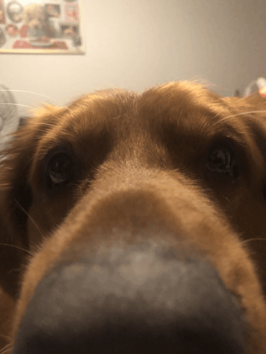 Paglalarawan ng Content: a close up of a dog 's nose with a picture of a dog on the wall behind it