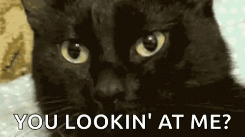 Paglalarawan ng Content: a black cat looking at the camera with the words you lookin ' at me below it