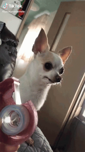 Paglalarawan ng Content: a small white dog is looking at the camera with a tik tok watermark