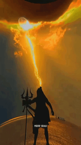 Paglalarawan ng Content: a silhouette of a man holding a trident with a fire coming out of his mouth .