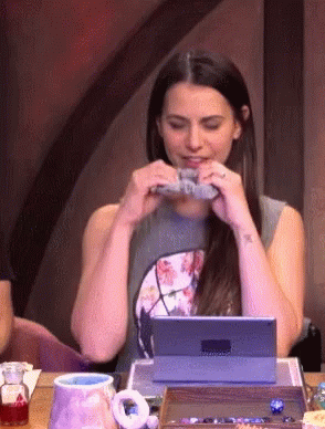 Paglalarawan ng Content: a woman with a tattoo on her wrist is eating a piece of food