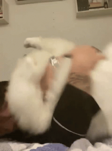 Paglalarawan ng Content: a person is laying on a bed with a white dog on their back .