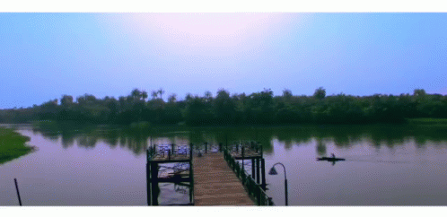 Paglalarawan ng Content: a man in a kayak is floating on a lake near a dock