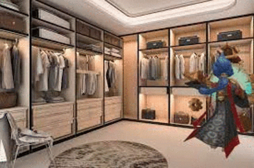 Paglalarawan ng Content: a cartoon character is flying through a walk in closet filled with lots of clothes .