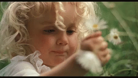 Paglalarawan ng Content: a little girl with curly blonde hair is holding a daisy in her hands .