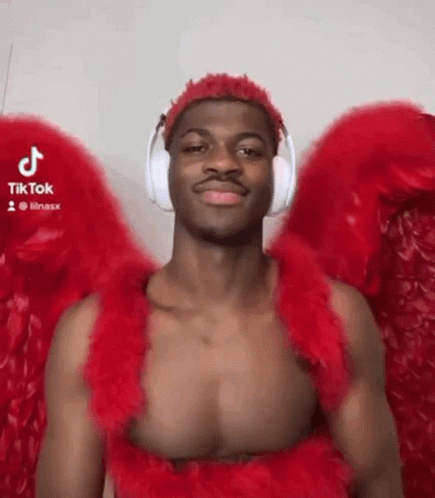 Paglalarawan ng Content: a shirtless man wearing red feathered wings and headphones is smiling .