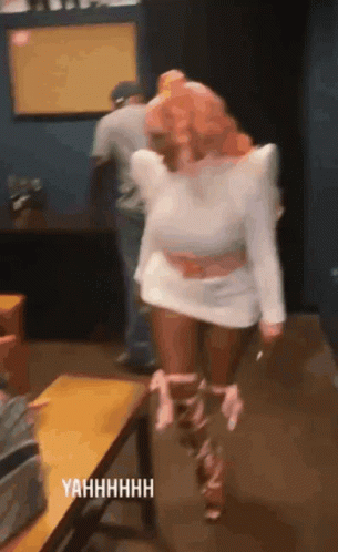 Paglalarawan ng Content: a woman with pink hair is standing in a room wearing a white top and thigh high boots .