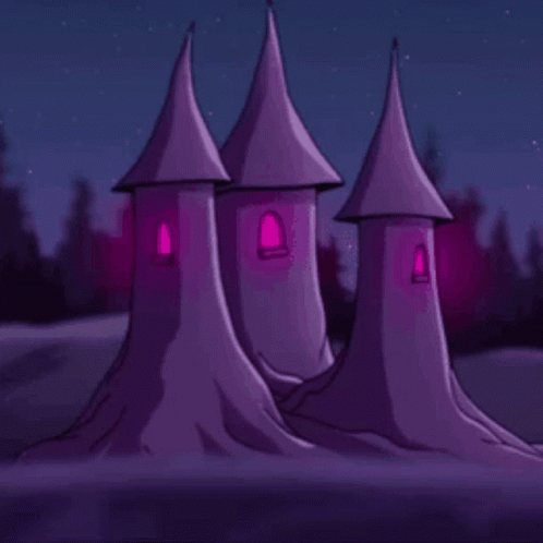 Paglalarawan ng Content: a cartoon of three purple castles with pink lights in the windows