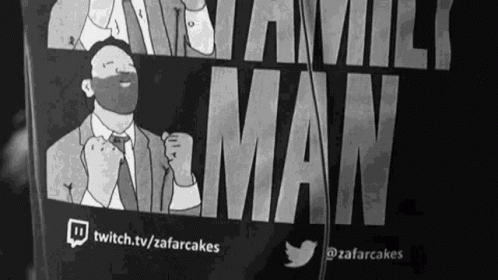 Paglalarawan ng Content: a black and white photo of a man in a suit and tie with the words `` family man '' written on it .