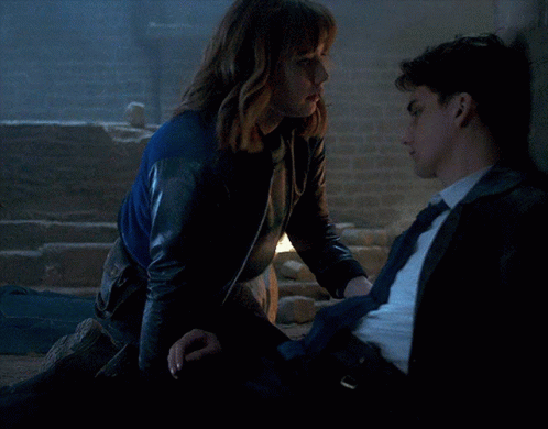 Paglalarawan ng Content: a woman in a leather jacket sits on a man 's lap in a dark room