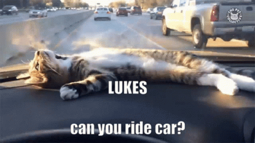 Paglalarawan ng Content: a cat is laying on the dashboard of a car asking lukes can you ride car