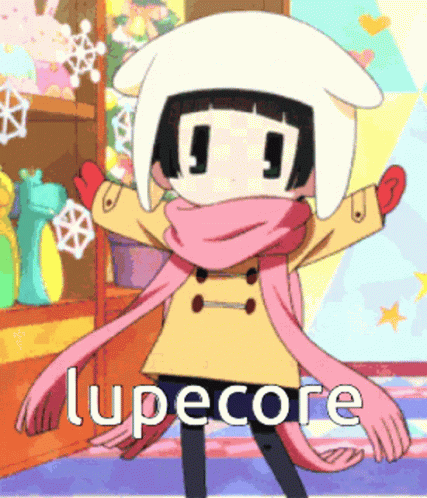 Paglalarawan ng Content: a cartoon character wearing a pink scarf and gloves with the word lupecore on the bottom