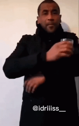 Paglalarawan ng Content: a man in a black coat is holding a glass and making a face .