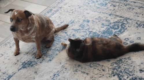Paglalarawan ng Content: a dog and a cat laying on a rug looking at each other