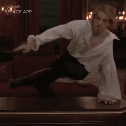 - Paglalarawan ng Content: a man in a white shirt and black pants is dancing in a room with the words made with reface app above him