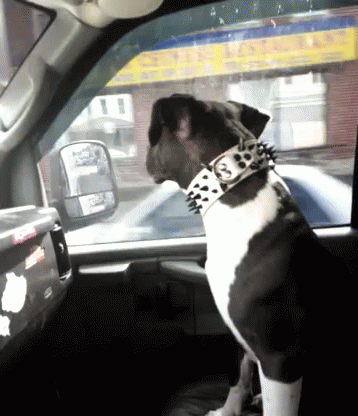Paglalarawan ng Content: a black and white dog wearing a studded collar is sitting in a car