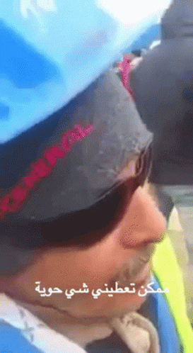 Paglalarawan ng Content: a man wearing sunglasses and a blue hat has arabic writing above his face
