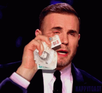 Paglalarawan ng Content: a man in a suit and tie is crying while holding a piece of money with the number 013 on it