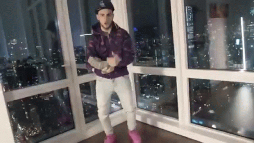 Paglalarawan ng Content: a man in a purple jacket and pink shoes is standing in front of a window .
