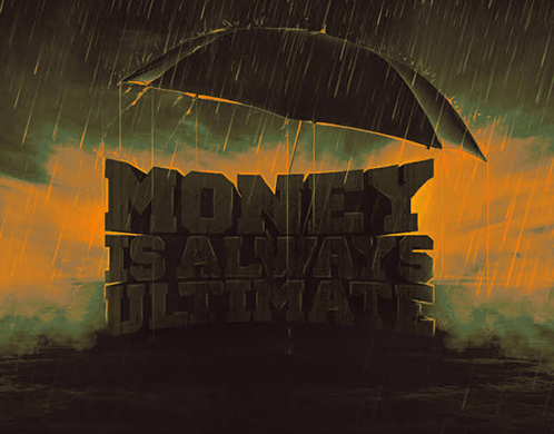 Paglalarawan ng Content: a poster that says money is always ultimate with an umbrella in the rain