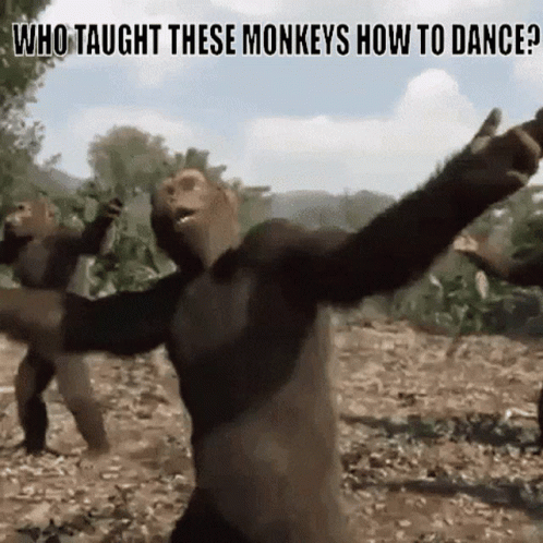 Paglalarawan ng Content: a group of monkeys are dancing in a field with a caption that says who taught these monkeys how to dance