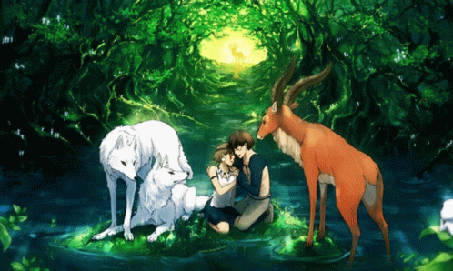 Paglalarawan ng Content: a man and a woman are kneeling next to a wolf and a deer
