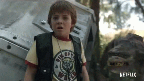 Paglalarawan ng Content: a young boy wearing a shirt that says paw of the world is standing in front of a monster .