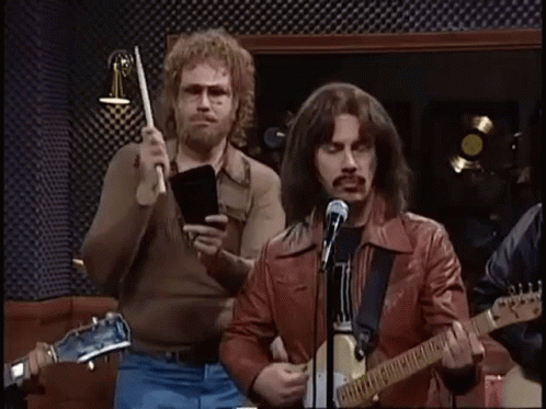 Paglalarawan ng Content: a man with long hair is singing into a microphone while another man holds a drum stick .