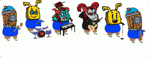 Paglalarawan ng Content: a group of cartoon characters are playing instruments including drums and a keyboard