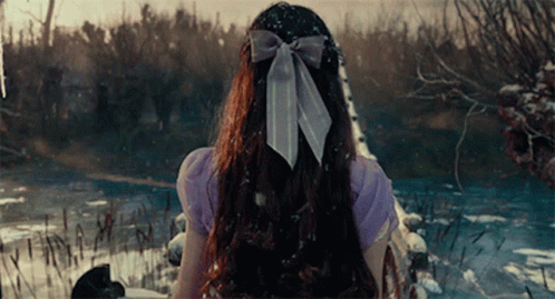 Paglalarawan ng Content: a girl in a purple dress with a bow in her hair looks out over a body of water