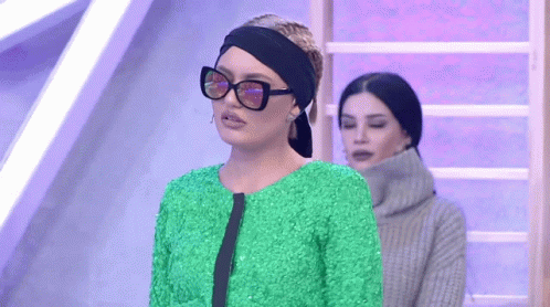 Paglalarawan ng Content: a woman in a green jacket and sunglasses stands next to another woman in a sweater