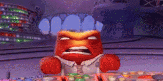 Paglalarawan ng Content: a cartoon character with a very angry face is sitting at a table with buttons .