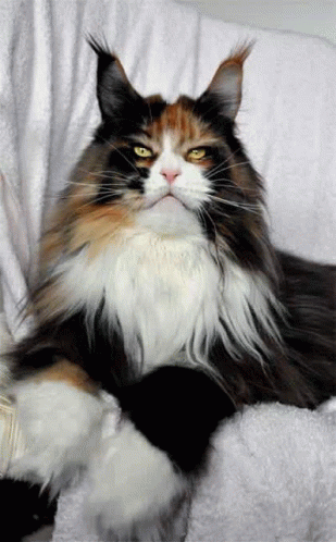 Paglalarawan ng Content: a calico cat is laying on a white blanket on a couch and looking at the camera .