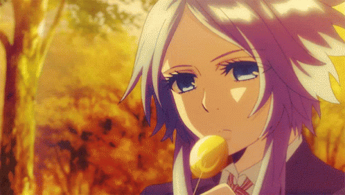 Paglalarawan ng Content: a girl with purple hair and blue eyes is eating a yellow lollipop