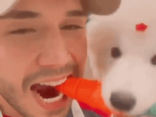 Paglalarawan ng Content: a man is holding a toy in his mouth and a dog is looking at him .