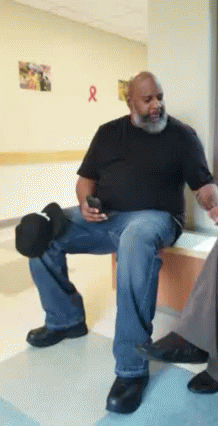 Paglalarawan ng Content: a man sitting on a bench in a hallway with a red ribbon on the wall