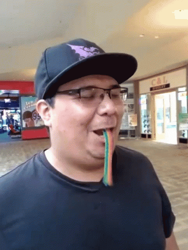 Paglalarawan ng Content: a man eating a rainbow colored candy in a mall