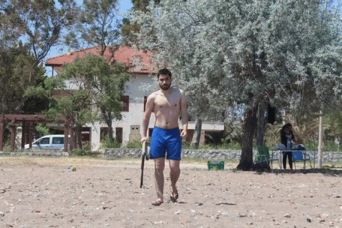 Paglalarawan ng Content: a shirtless man in blue shorts walking on a sandy beach