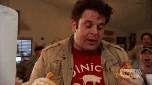 Paglalarawan ng Content: a man wearing a red shirt with pigs on it eats a pizza