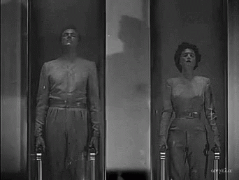 Paglalarawan ng Content: a black and white photo of a man and woman standing next to each other in a glass case .
