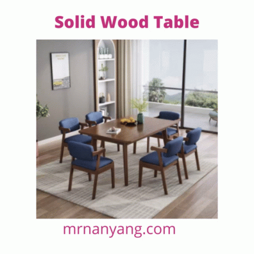Paglalarawan ng Content: a picture of a solid wood table with blue chairs in a living room
